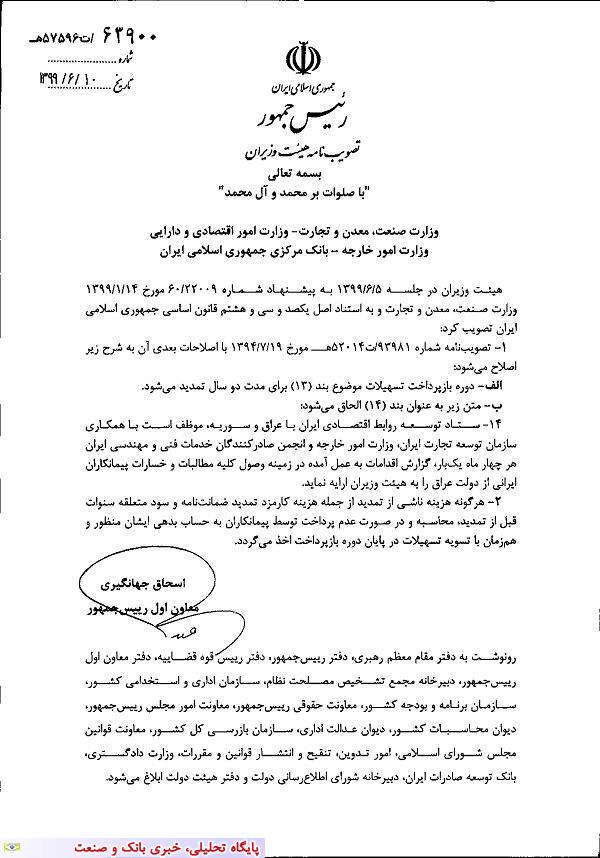 معاون اول رئیس جمهور مصوبه هیئت دولت مبنی بر تمدید 2 سال دیگر به بازپرداخت تسهیلات صادرکنندگان خدمات فنی و مهندسی به عراق را برای اجرا ابلاغ کرد.