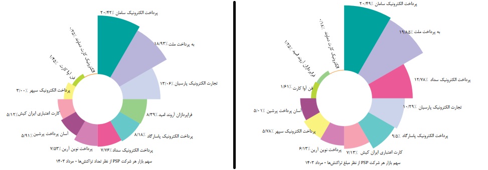 بر اساس مبلغ تراکنش ها، پرداخت الکترونیک سامان با 20.42% سهم، در صدر قرار دارد و پس از آن به پرداخت ملت با 20.49% جایگاه دوم را به خود اختصاص داده است. این تفاوت کوچک نشان دهنده رقابت بسیار نزدیک میان شرکت های پیشرو در این صنعت است. همچنین، پرداخت الکترونیک پاسارگاد و آروند امید فراپردازان در این بخش نیز تغییراتی را در سهم بازار تجربه کرده اند.