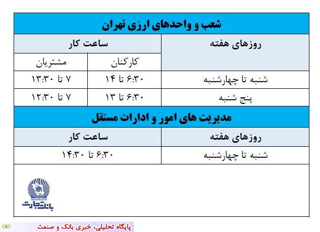 تمدید تغییر ساعت کار شعب بانک تجارت در استان تهران