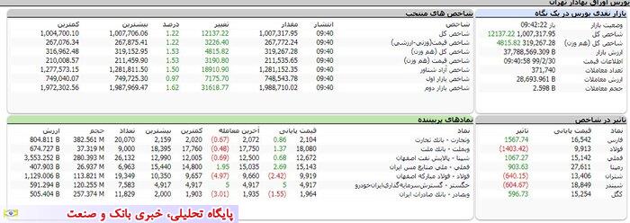 از روز گذشته شاخص بورس در آغاز معاملات، مسیر خود را تغییر داد و با بیش از 20 هزار واحد افزایش وارد مدار افزایشی شد، حال بازار امروز در ادامه روند معاملاتی دیروز با بیش از 12 هزار واحد رشد دوباره وارد کانال یک میلیون واحد شد و تا لحظه تنظیم این خبر (9 و 42 دقیقه) با 12 هزار و 137 واحد رشد به عدد یک میلیون و چهار هزار واحد رسید.