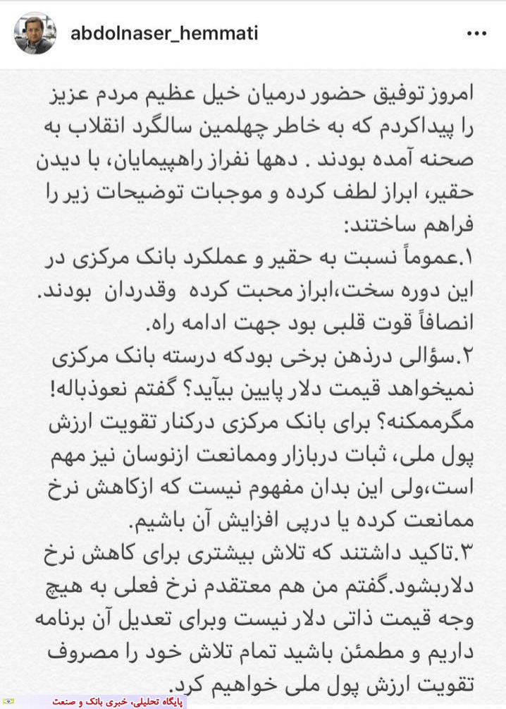 به گزارش پایگاه تحلیلی خبری بانک و صنعت، عبدالناصر همتی پس از حضور در مراسم راهپیمایی 22 بهمن ماه با انتشار پیامی در صفحه اینستاگرام خود نوشت: امروز توفیق حضور در میان خیل عظیم مردم عزیز را پیدا کردم که به خاطر چهلمین سالگرد انقلاب به صحنه آمده بودند. دهها نفر از راهپیمایان، با دیدن حقیر، ابراز لطف کرده و موجبات توضیحات زیر را فراهم ساختند: