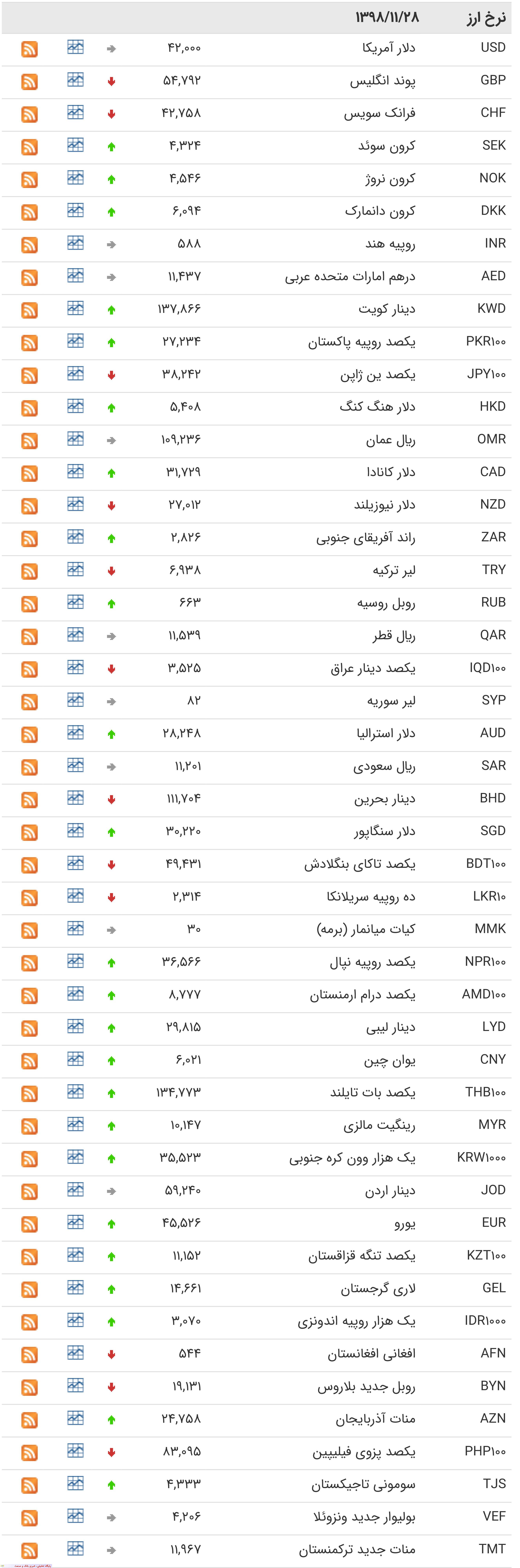 افزون بر این، هر فرانک سوئیس 42 هزار و 758 ریال، کرون سوئد 4 هزار و 324 ریال، کرون نروژ 4 هزار و 546 ریال، کرون دانمارک 6 هزار و 94 ریال، روپیه هند 588 ریال، درهم امارات متحده عربی 11 هزار و 437 ریال، دینار کویت 137 هزار و 866 ریال، یکصد روپیه پاکستان 27 هزار و 234 ریال، یکصد ین ژاپن 38 هزار و 242 ریال، دلار هنگ کنگ 5 هزار و 408 ریال، ریال عمان 109 هزار و 236 ریال و دلار کانادا 31 هزار 729 ریال قیمت خورد.